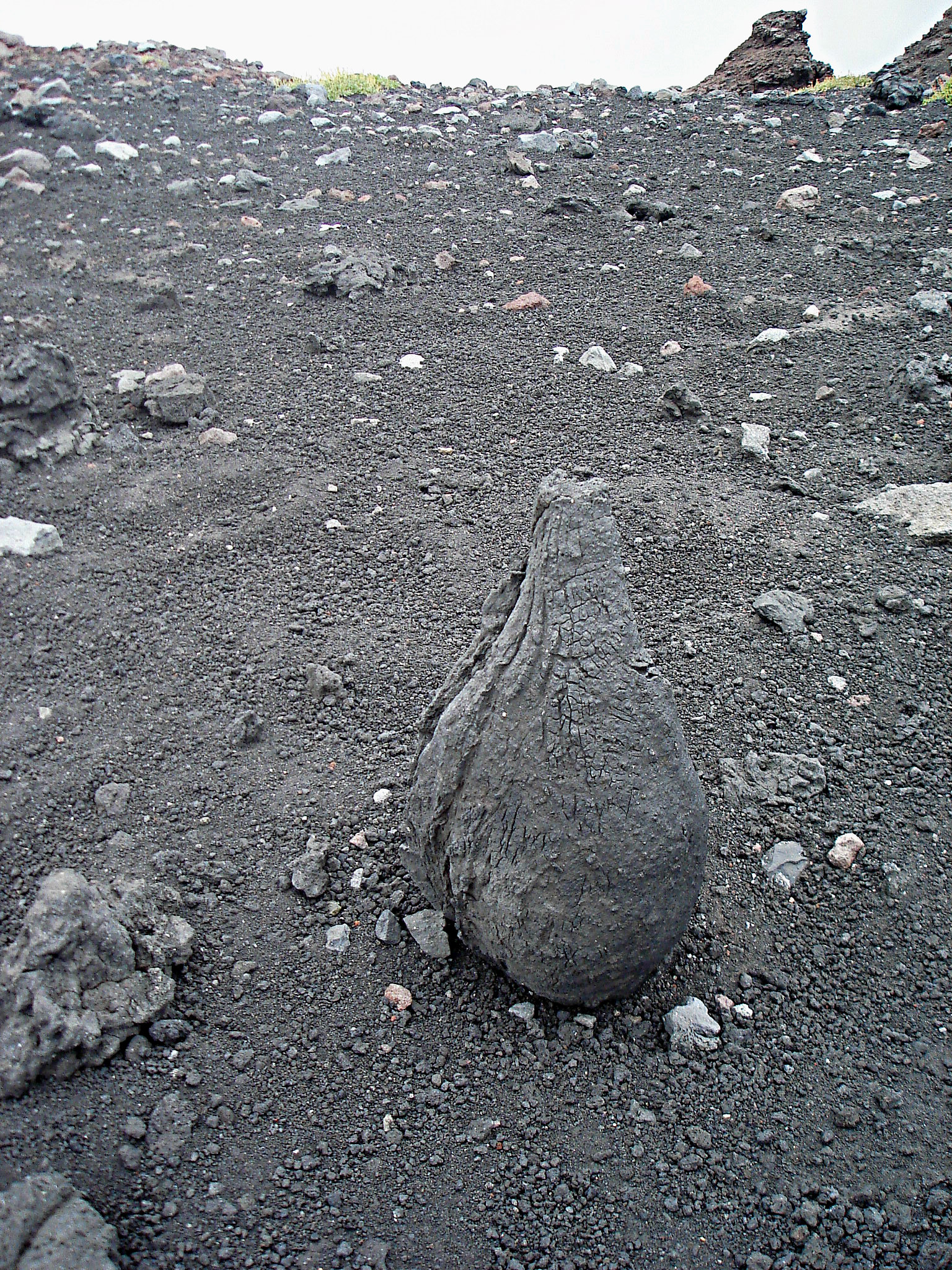Bombe volcanique en forme de goutte d’eau, autour du cratère sommital "Bocca nuova" de l’Etna.