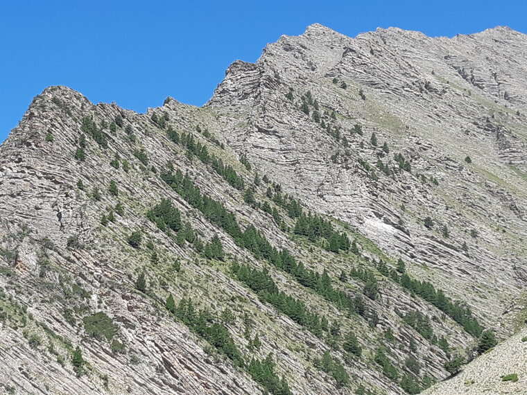 Perchés sur les hauts sommets des Alpes, ces sapins montrent un alignement entre eux... et parallèles aux strates sédimentaires constituant la montagne.