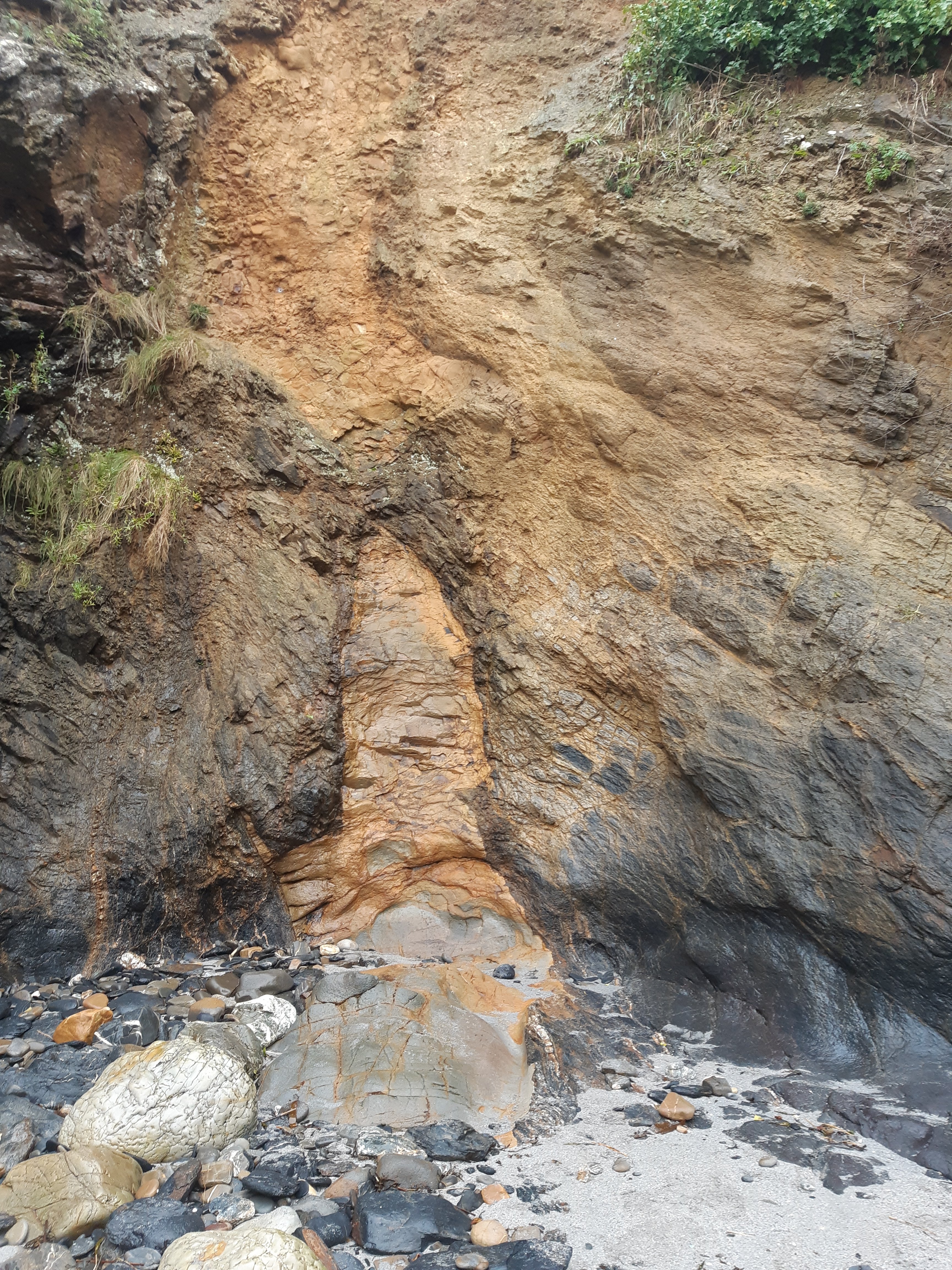 Dans la partie haute de la falaise, elle est bien altérée, notamment par la circulation de l’eau de pluie qui lui fait prendre des teintes oranges d’oxydation.