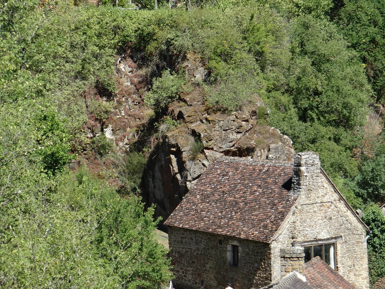 Granodiorite cadomienne à cordiérite (massifs d’Izé et de Saint-Pierre-des-Nids), roche à l’aspect très massif visible un peu partout dans le village.