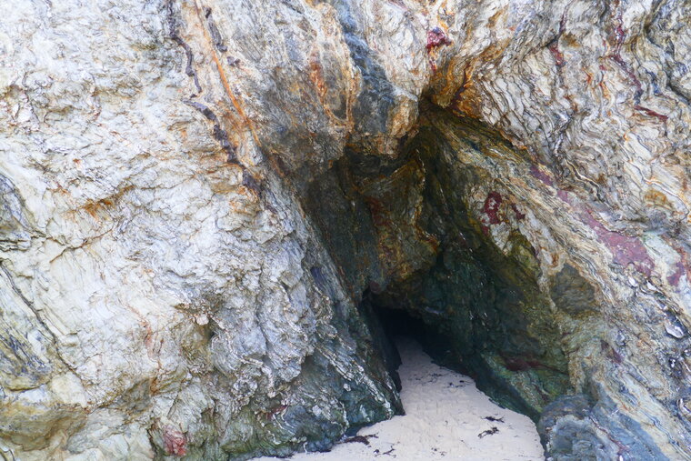 La faille dans la falaise dont le plan est parallèle à la schistosité ce qui l’a rend peu visible mais elle a quand même créé une zone broyée d’environ 50cm d’épaisseur qui l’a rend plus vulnérable à l’érosion et se présente donc en creux. Ceci forme une grotte dans la falaise.