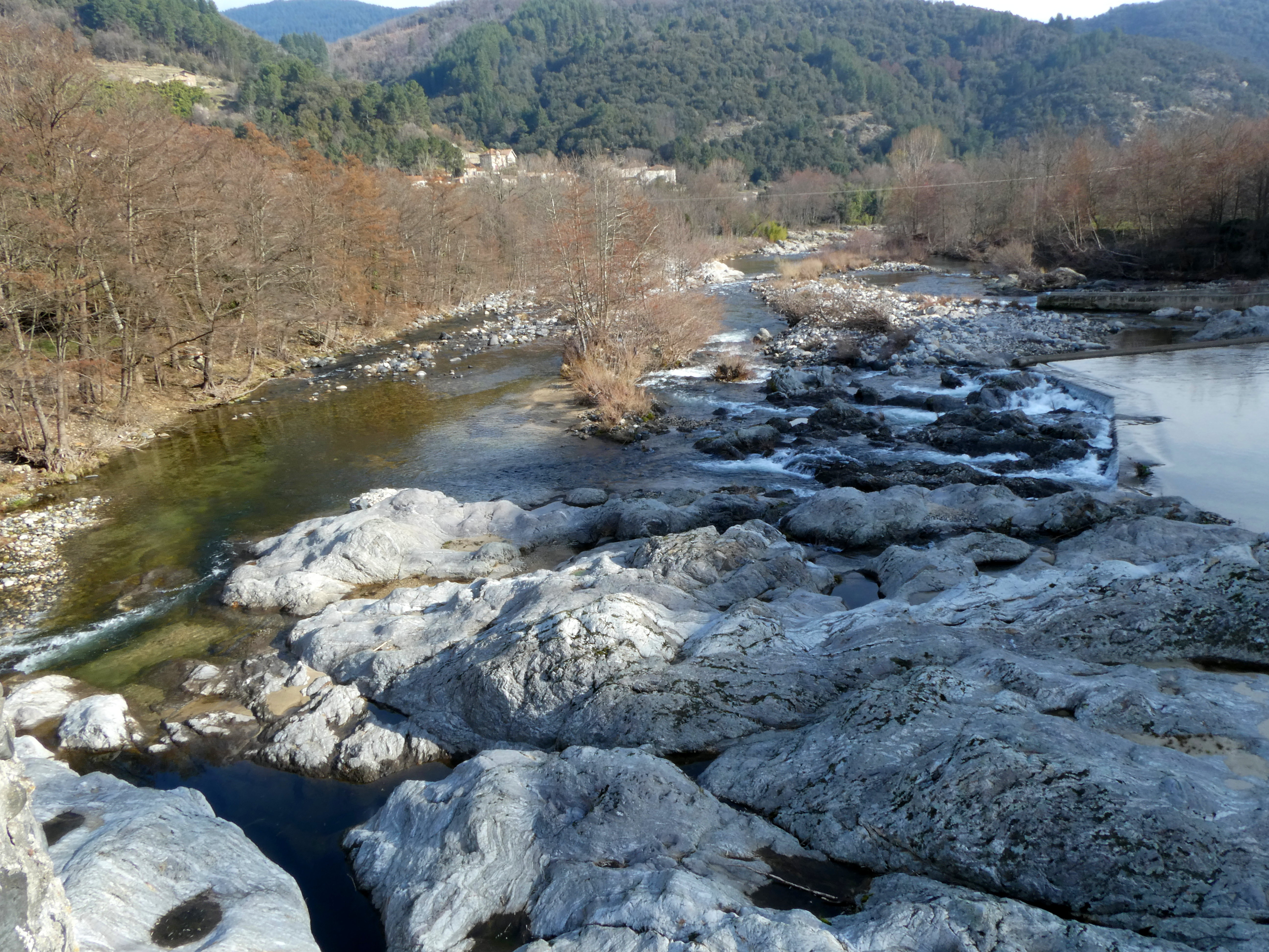 La photographie montre la partie de l’affleurement en aval de la passerelle.