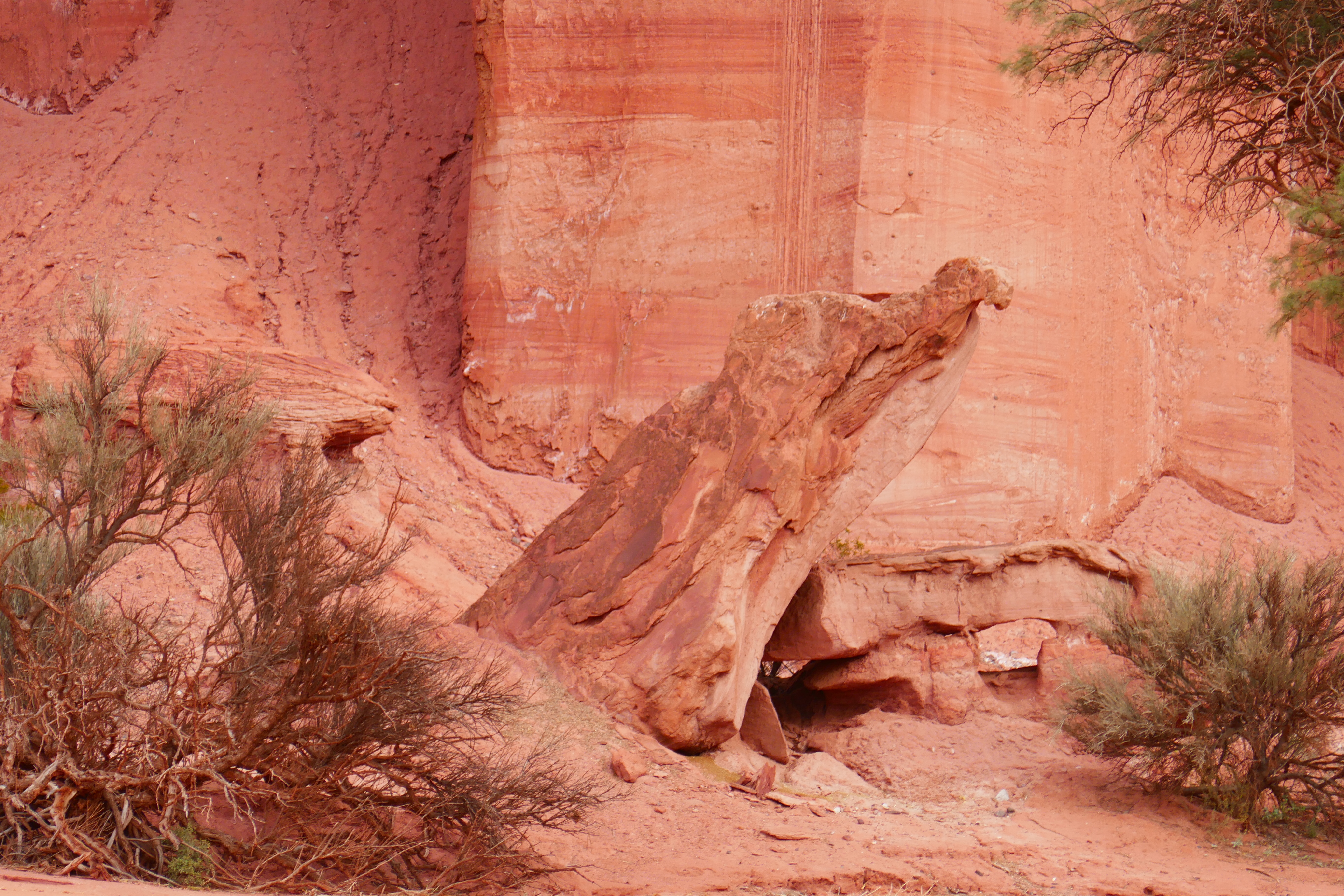 L’érosion des grès fins fluviatiles olénékiens (trias inférieur) forme ici un rocher issu de l’effondrement d’un pan de falaise et ayant une silhouette de condor.