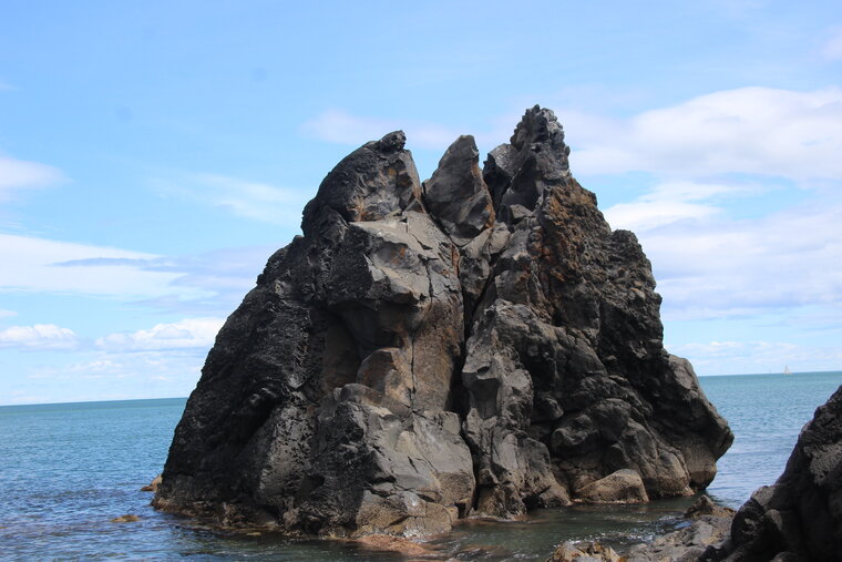 Si le volcan de la Grande Conque a connu surtout une activité surtseyenne (avec interaction de l’eau et du magma), il a connu aussi une activité strombolienne plus classique avec bombes, scories mais aussi coulées de lave comme le montre cet éperon rocheux à une des pointe de la crique de la Grande Conque.