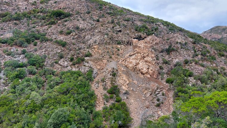 Depuis le golfe de Chiuni, au Nord de Cargèse, jusqu’à l’Est de Marignana, sont regroupés tout un ensemble d’indices de sulfures qui se disposent dans une bande de terrain, orientée WSW-ENE, de 20 km de long sur 1 à 2 km de large. Elle est localisée sur un train d’accidents qui affectent la zone de contact entre les intrusions U1 et U2. Ce contact est fréquemment souligné par des concentrations d’amphibole et des plaquages de pyrite. Le secteur de Prunelli est le plus important de ce district. Les gîtes de Prunelli (lieu-dit Livida Male) se trouvent en rive droite du torrent de Sulleoni, sur la commune de Marignana.