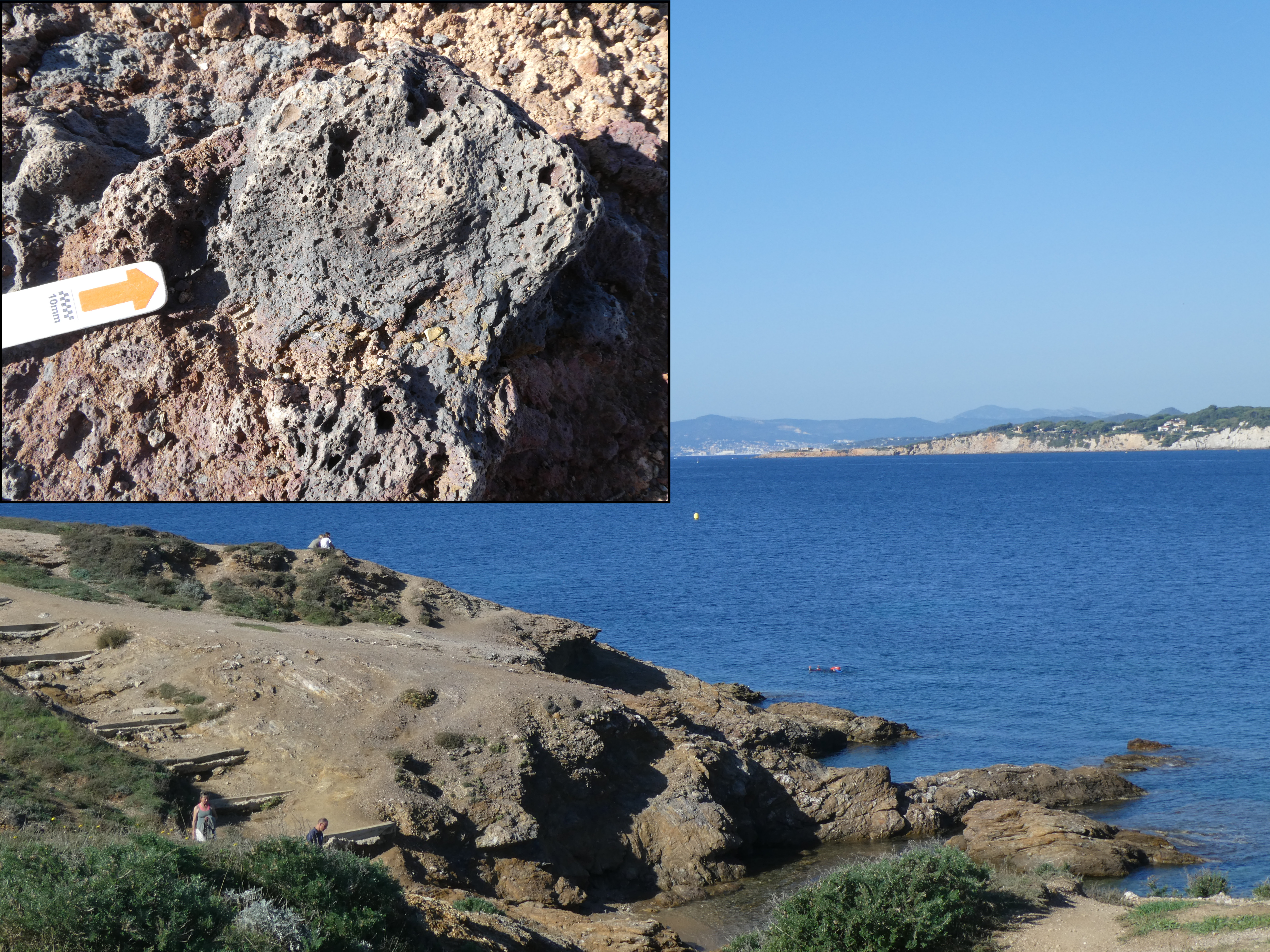La Pointe du Cap Nègre (fermant au sud la Baie de Sanary) est constituée de produits volcaniques interstratifiés dans des phyllades.