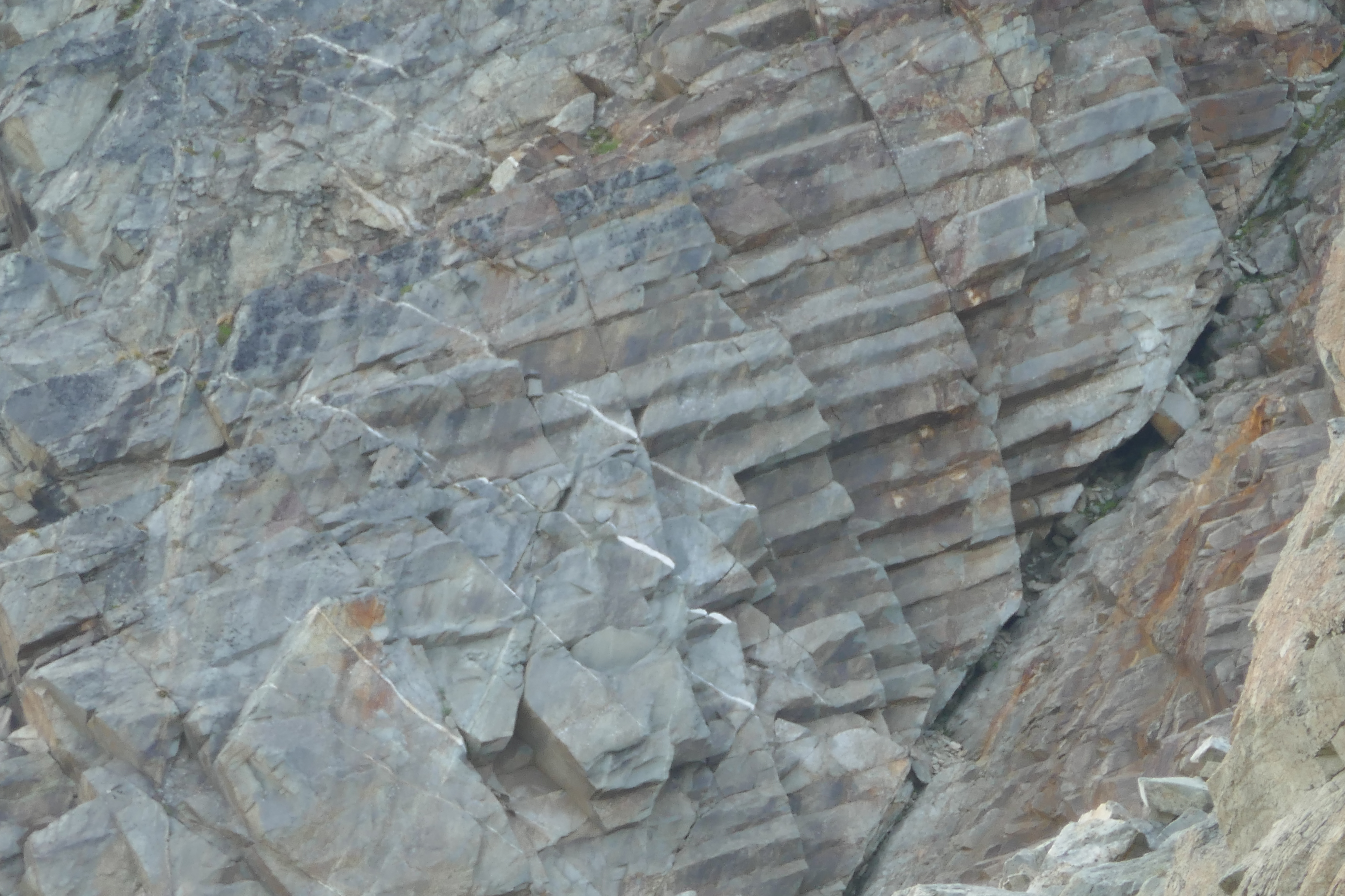 Les sédiments du Crétacé supérieur qui constituent la montagne de Whistler sont intercalés par des coulées de lave souvent d’andésite ou de dacite. Certaines sont facilement reconnaissable grâce aux prismations qui affectent leur masse comme ici.