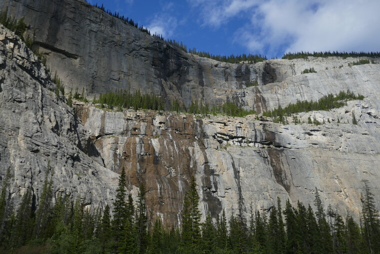 Le long de la "Icefield Parkway", route qui traverse du nord au sud le cœur des rocheuses se situe une falaise massive : Le mur des lamentations (Weeping wall) qui a pris ce nom à cause du ruissèlement et des cascades qui s’écoulent le long de ses parois qui sont des calcaires du Dévonien appartenant à la formation de Palliser.