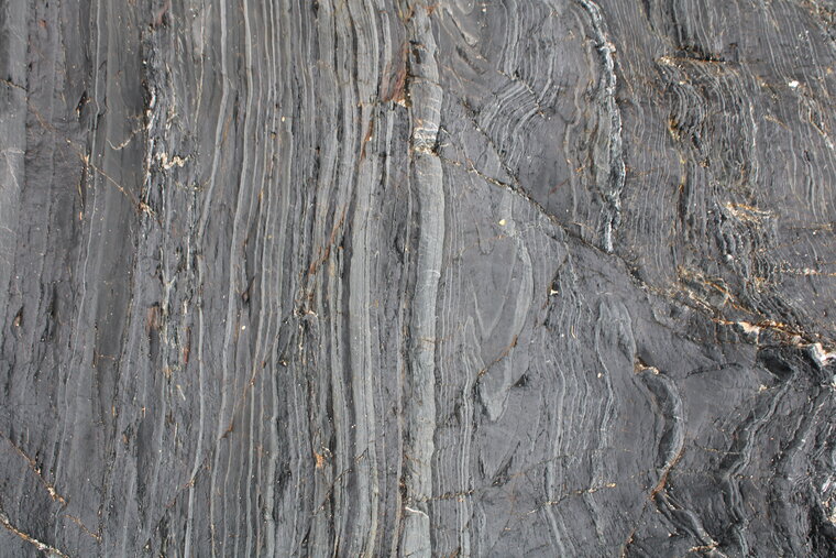 Ces schistes rubanés sont formés par des séquences de turbidites fines avec des strates peu épaisses (de l’ordre du cm) et surtout des éléments ne dépassant pas la taille d’un petit grain de sable. Cela veut dire que si nous sommes au pied de reliefs sous-marins où s’écoulent des avalanches mais la zone de dépôt se situait assez loin des pentes du relief : On parle de turbidites distales. Ces turbidites sont d’âge protérozoïque supérieur et plus précisément dans une période nommée dans le massif armoricain "Briovérien". Ces roches ont subis à la fois l’orogénèse cadomienne (panafricaine) et hercynienne (varisque) d’où leur redressement important et parfois même leur plissement comme en témoigne certains autres affleurements du secteur ou même sur la partie droite du cliché où sont présents des microplissements.