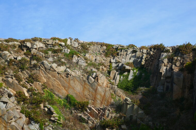 On note sur cette photo de nombreuses diaclases aux directions variées mises en place lors de la solidification et le refroidissement du granite.