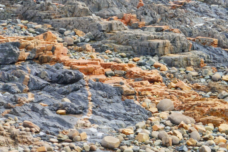 Le platier rocheux au large des falaises granitiques de Flamanville est constitué de cornéennes, des roches sédimentaires métamorphisées par contact avec le magma du pluton granitique. Ce platier rocheux est injecté ici d’un gros filon (sills) de granite de même nature et de même âge que le pluton proche. On voit en plus, des petits filons qui sont constitués d’aplite, de même composition aussi que le granite mais cristallisé beaucoup plus finement avec des grains de taille de l’ordre du millimètre.