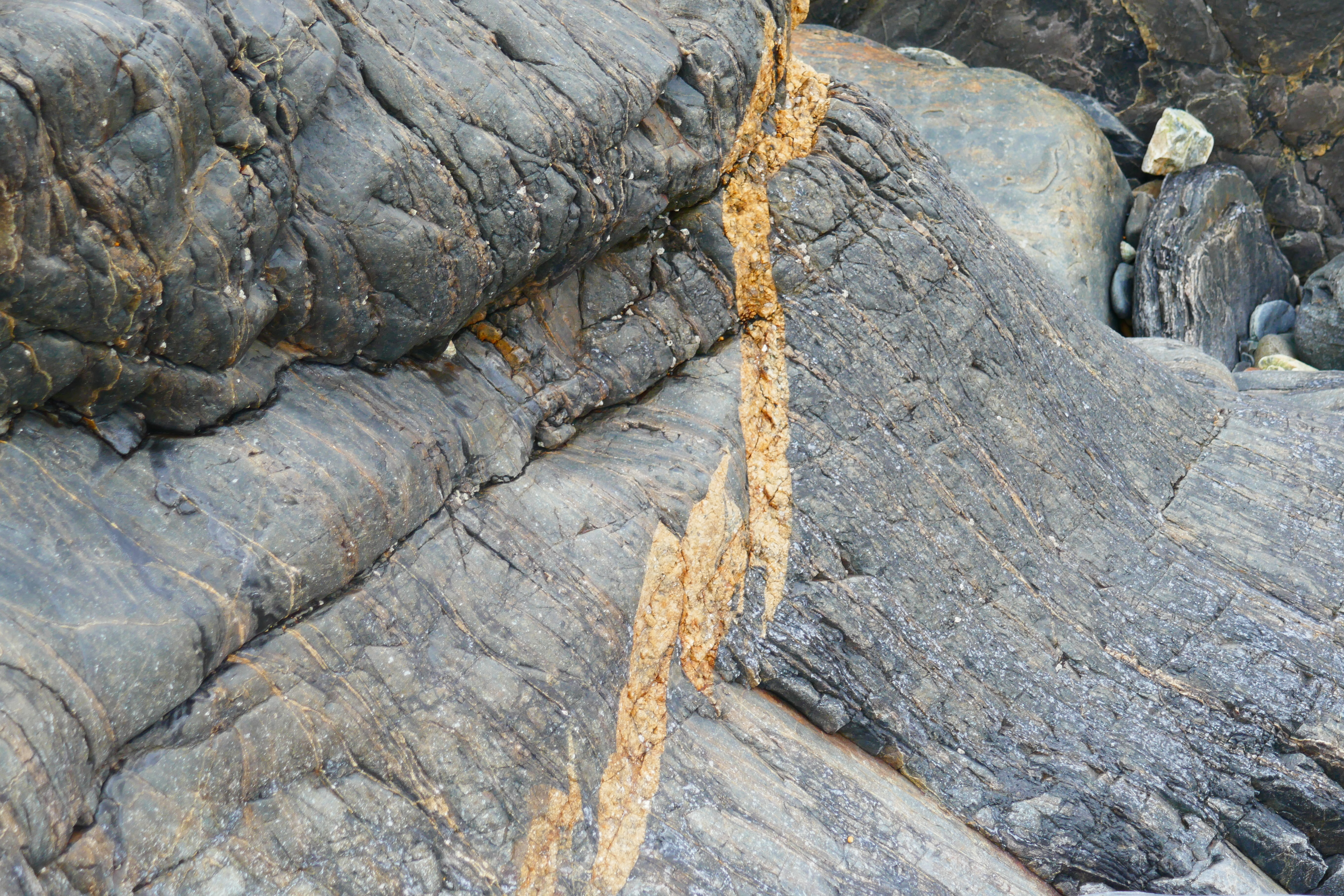 Les cornéennes de Flamanville sont ici parcourues par des fentes en échelons.