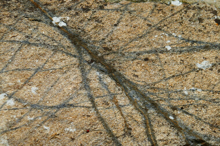 Le faciès de Cambernon (de bordure) se distingue du faciès de cœur classique par une plus grande richesse en quartz et en feldspath potassique ainsi qu’une plus grande pauvreté en hornblende noire. La roche de Cambernon est donc plus claire mais ce qui la distingue du faciès classique c’est la présence d’injections (sûrement par des diaclases) de minéraux oxydés qui forment des veines sombres sur fond clair.