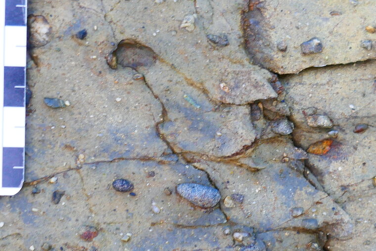 Les roches détritique de la pointe du Lude peuvent prendre divers faciès depuis les roches à éléments très fins comme les schistes dérivant de sédiments argileux aux conglomérats grossiers dont les éléments peuvent faire plusieurs centimètres : Ici nous avons un conglomérat avec de gros éléments mais ceux-ci sont dispersés dans une matrice abondante à dominante gréseuse plutôt fine : On dit que le conglomérat est matrice porté alors qu’en général dans les conglomérat les éléments se touchent, on dit qu’ils sont dans ce cas, "clastes portés".