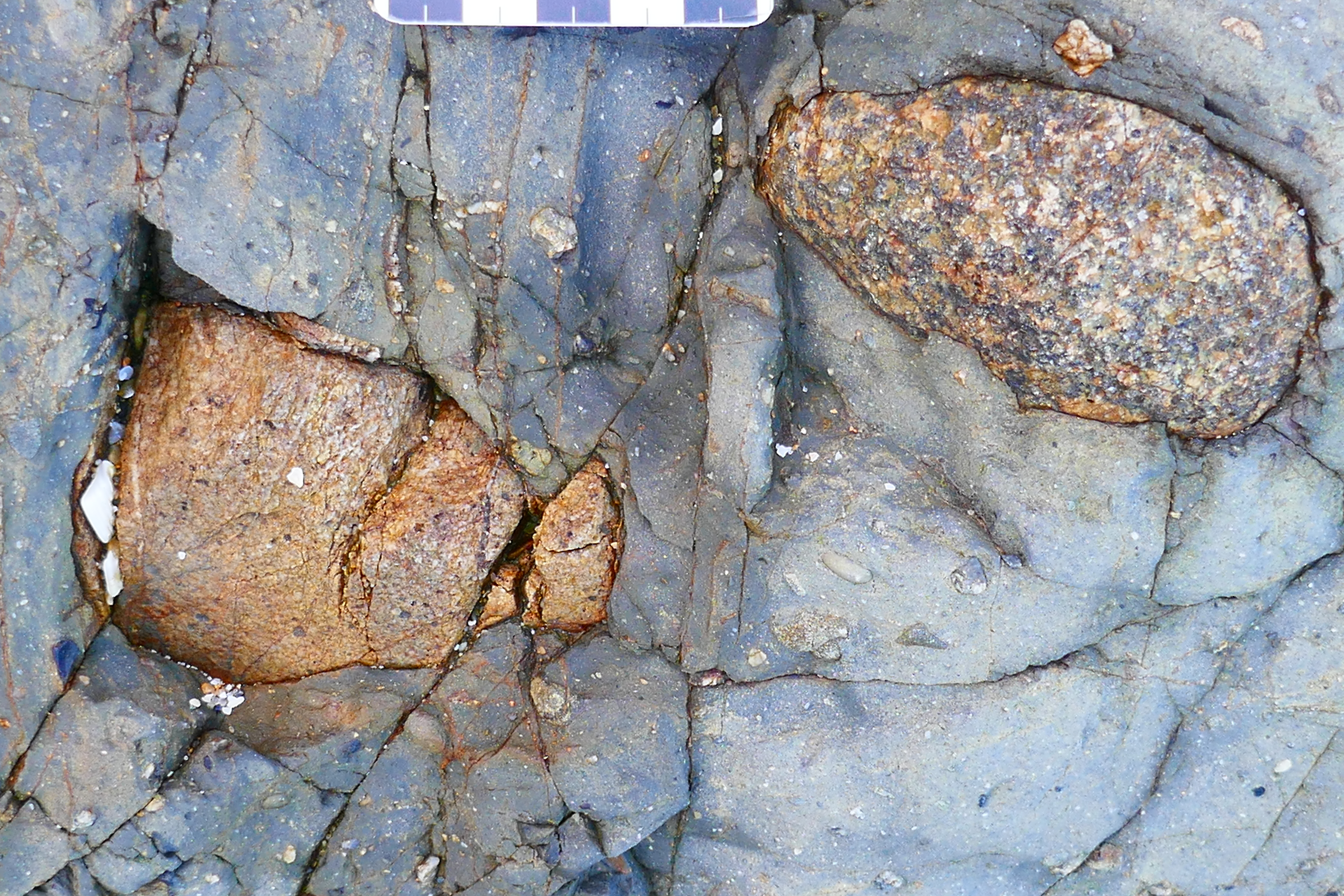 Les roches détritique de la pointe du Lude peuvent prendre divers faciès depuis les roches à éléments très fins comme les schistes dérivant de sédiments argileux aux conglomérats grossiers dont les éléments peuvent faire plusieurs centimètres comme ici avec deux blocs de granite rose : Ici nous avons un conglomérat avec de gros éléments mais ceux-ci sont dispersés dans une matrice abondante à dominante gréseuse plutôt fine : On dit que le conglomérat est matrice porté alors qu’en général dans les conglomérat les éléments se touchent, on dit qu’ils sont dans ce cas, "clastes portés".