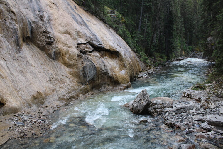 La cascade supérieur du canyon Johnston, présente une remarquable formation de tuf calcaire travertin produit par la précipitation de carbonate de calcium à cause de la rupture des équilibres chimiques au cours de la chute d’eau.