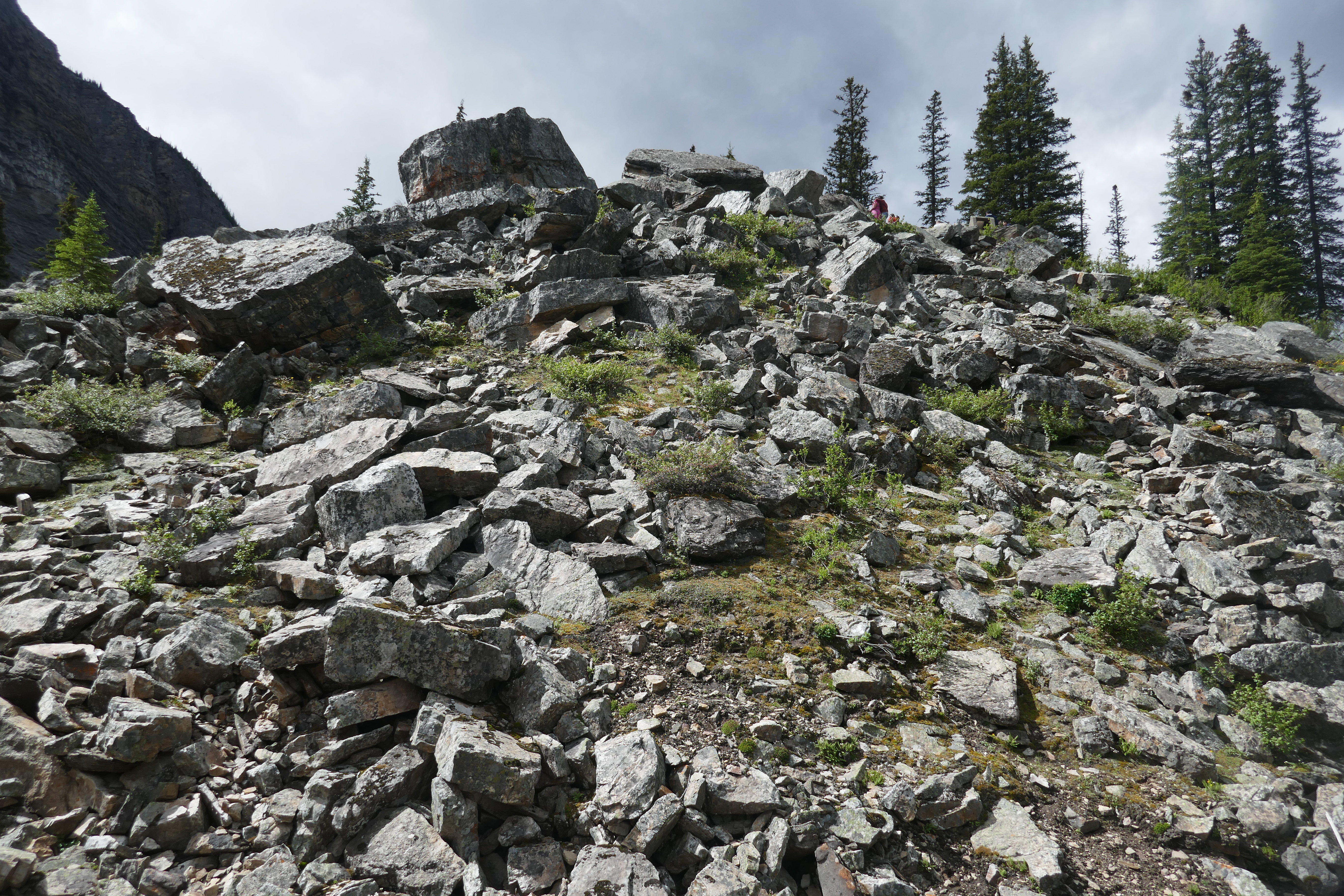 L’existence du lac Moraine est due à la présence d’un barrage de bloc qui entrave l’écoulement des eaux issues de la fonte des neiges et des glaciers alentours. Le barrage qui retient ses eaux n’est pas tout à fait une moraine classique mais proviendrait plutôt d’un éboulement gigantesque datant de la dernière période glaciaire. Un flanc de montagne se serait ainsi effondré au-dessus de la langue glaciaire qui prenait place à l’endroit du lac actuel. Les roches issus de cet éboulement se seraient accumulés sur la glace qui aurait transporté les roches plus en aval. Les rochers se seraient déposés une fois la glace fondue au fond de vallée créant le barrage. Nous voyons ainsi que malgré la particularité de l’origine des blocs rocheux (un grand éboulement cataclysmal) nous nous trouvons dans un mode de formation très similaire à celui d’une moraine frontale classique. La nature des blocs rocheux ont pour origine des formations sédimentaires du cambrien.