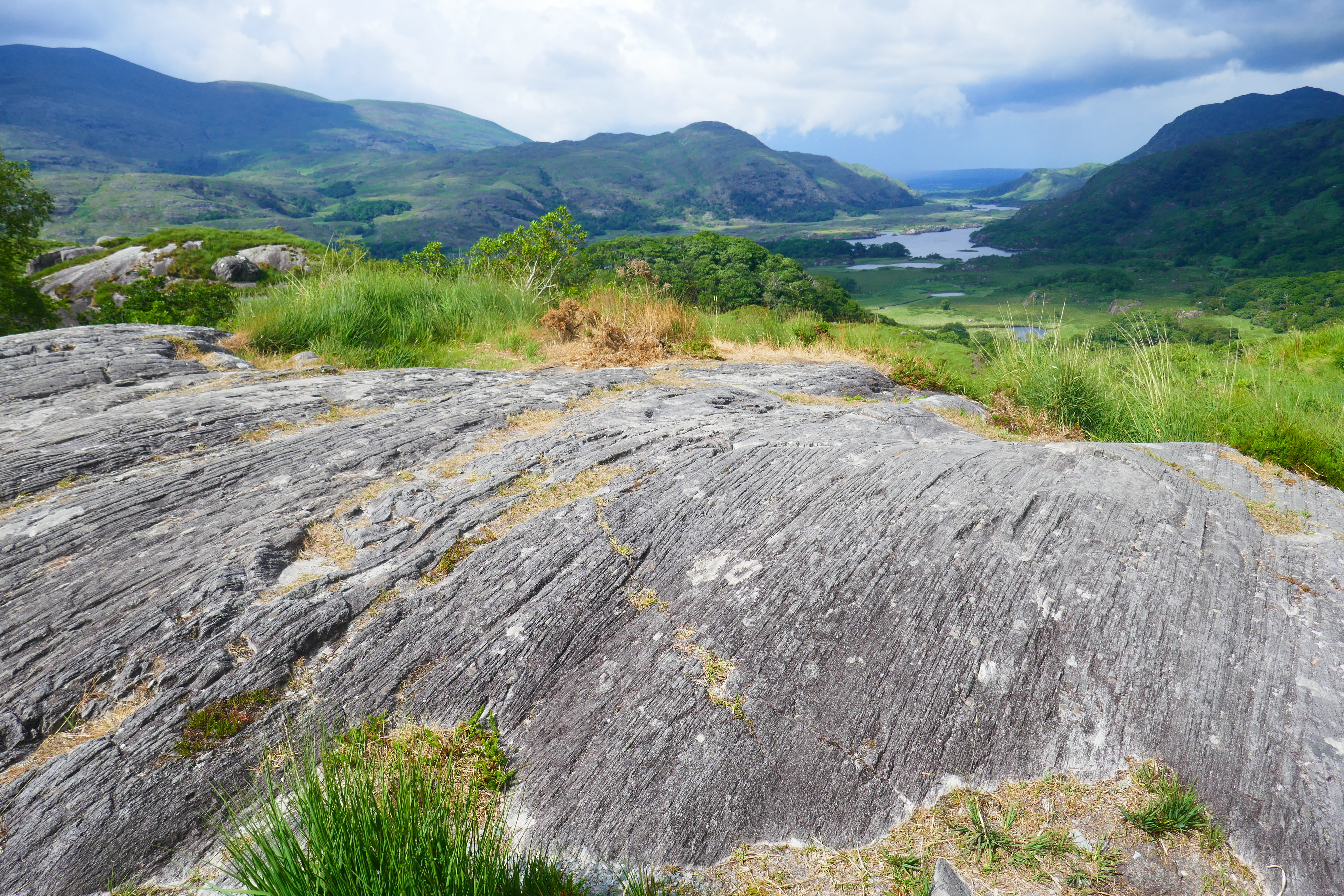 Durant la dernière glaciation du Würm la quasi-totalité des îles britanniques étaient recouvertes par une calotte glaciaire. Ces glaciers géants ont laissé des traces de leur passage comme ici dans le parc national de Kilarney où on peut voir à la fois des stries produites par le frottement de cailloux charriés par la glace et l’effet de l’érosion glaciaire avec des roches à l’aspect mamelonné.