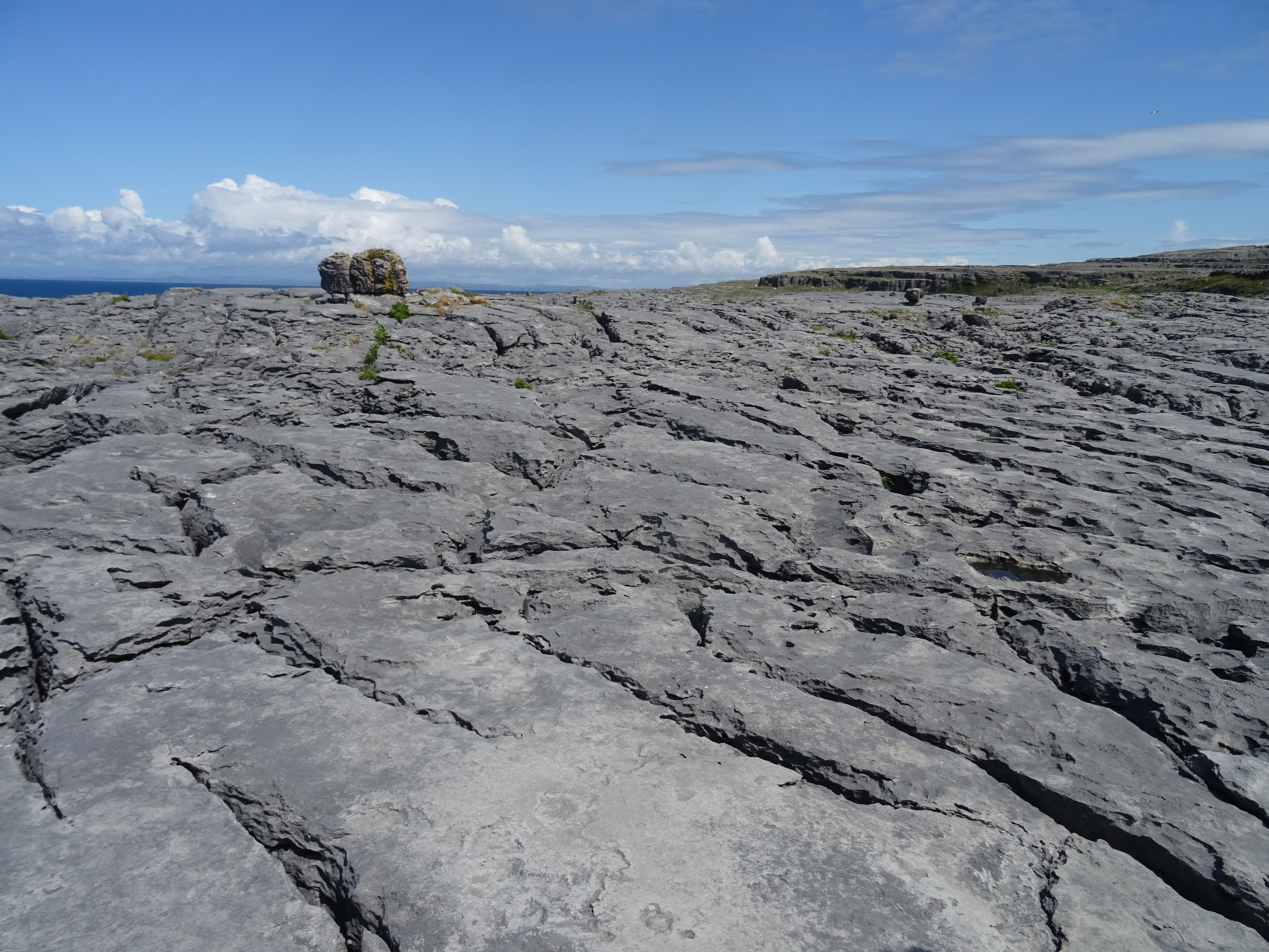 Cette surface d’abrasion de la province du Burren permet de voir les figures de dissolution dans le calcaire carbonifère formant un lapiez. La surface d’abrasion est d’origine glaciaire. Durant la dernière glaciation (Würm qui s’est terminée il y a 12 000ans) une grande partie de l’Irlande était recouverte par une calotte glaciaire. On peut d’ailleurs apercevoir sur l’arrière plan un bloc erratique.