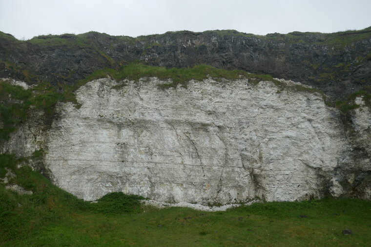 Falaise de craie d’époque Maastrichtienne surmontées par des coulées basaltiques tholéitiques appartenant à la même formation paléogène que celle de la chaussée des géants. La Chaussée des Géants appartient à la large province magmatique (LIP, Large Igneous Province ) de l’Atlantique nord (NAIP, North Atlantic Igneous Province) mise en place au début du tertiaire. L’épanchement volcanique de nature tholéitique a précédé l’ouverture de l’Atlantique Nord et l’on retrouve les coulées non seulement à la Chaussée des Géants voisine mais sur l’ensemble des rives de l’Atlantique Nord aussi bien du côté européen ou du côté groenlandais.