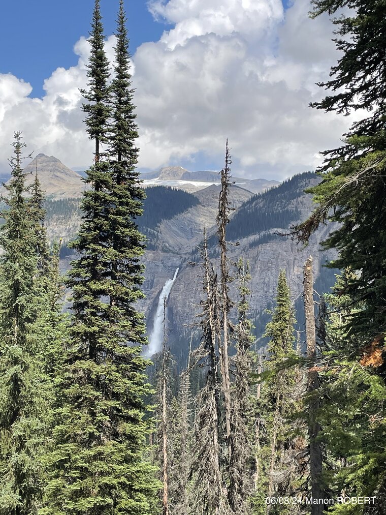 Situées dans le parc Yoho dans les rocheuses canadiennes, les chutes Takakkaws semblent venir de la roche (calcaire/dolomie). L’eau s’écoule sur environs 300m de dénivelé. La falaise depuis laquelle elle chute et celle d’où est prise la photo forment une vallée en U. Au dessus de Takakkaw, se trouve une vallée suspendue, trace aussi d’un ancien glacier ici. Au fond, un canyon/gorge semble être creusé par la circulation de l’eau venant du glacier Daly qui fond, visible plus loin au dessus.