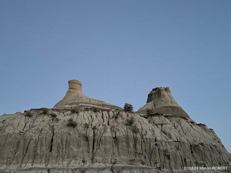 La roche est soumis à l’érosion par l’eau majoritairement, et le vent. Il y a 70-72Ma, le climat était plus chaud. Les Badlands sont composés principalement de strates grès et de boues assez cimentés, mais aussi de strates de roches plus dures à éroder comme la roche ferreuse (iron stone), de roches glacières erratiques, et de grès riche en fer. Ces roches plus dures protègent le grès plus tendre de l’érosion hydrique et éolienne. En revanche, les grès non protégés sont bien plus exposés aux vents et orages violents. Le fait qu’il y ait des grès protégés par des roches plus résistantes et d’autres exposées favorise une érosion différentielle, créant ainsi les hoodoos. Enfin, la gravité finit par renverser les roches lourdes (formant des chapeaux), et si cette partie s’en va, comme c’est le cas ici, alors le reste de la formation finit par s’éroder encore plus rapidement.