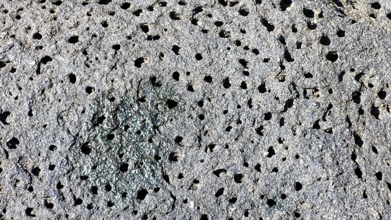 Origine : Les trous (vésicules) sont formés par des bulles de gaz qui se sont échappées du magma lors de l’éruption.