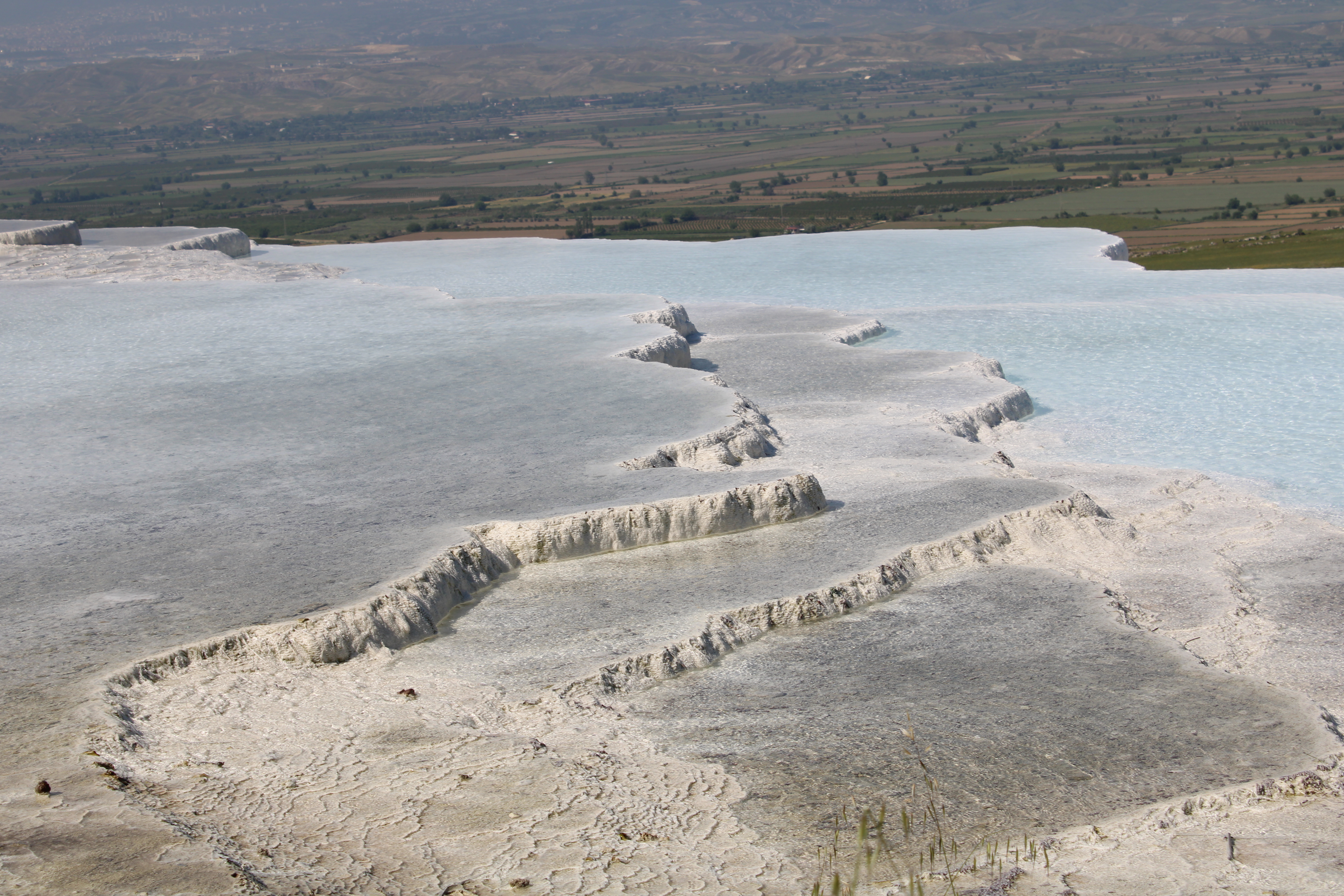 Ces formations de travertins sont constituées de calcite qui précipite à partir des eaux hydrothermales chaudes (au moins 35°) et très minéralisées à hauteur de 2,3g/L dont 1045mg/L d’hydrogénocarbonate, 464g/L de calcium, 91g/L de magnésium et 676g/L de sulfates). En arrivant en surfaces ces eaux très chargées refroidissent et dégazent provoquant la précipitation de calcite qui forment ces vasques. La richesse en minéralisation des eaux est en partie dû à la traversée de formations évaporitiques dans le secteur. La photo montre des vasques encore actives mais malheureusement le détournement de l’eau pour alimenter des piscines assèchent une grande partie de la formation.