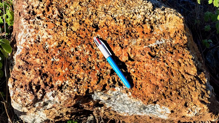 L’altération en surface extrêmement rugueuse, alvéolaire et de couleur rouille/ocre. L’olivine est un minéral très instable à la surface de la Terre. Sous l’action de l’eau et de l’oxygène, elle se dissout et s’oxyde. Le résultat : Le fer contenu dans l’olivine précipite sous forme d’oxydes et d’hydroxydes de fer (comme la limonite ou la goethite), créant cette couleur orange caractéristique. Les "trous" ou alvéoles correspondent aux endroits où les minéraux ont été lessivés par l’érosion.