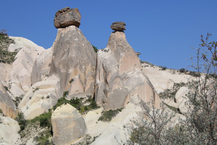 La région de la Cappadoce a été recouverte par les volcans de la région de nombreuses coulées d’ignimbrites entre -12Ma et 2Ma principalement. Le tuf ignimbritique a une dureté assez faible, ce qui a entrainé une érosion importante qui a créé ces paysages célèbres fait de pinacles et de cheminées de fées qui ont été parfois creusés et aménagées en habitat troglodytique. Ici les chapeaux des cheminées de fées sont faits non pas tuf mais de reste de coulées de lave.
