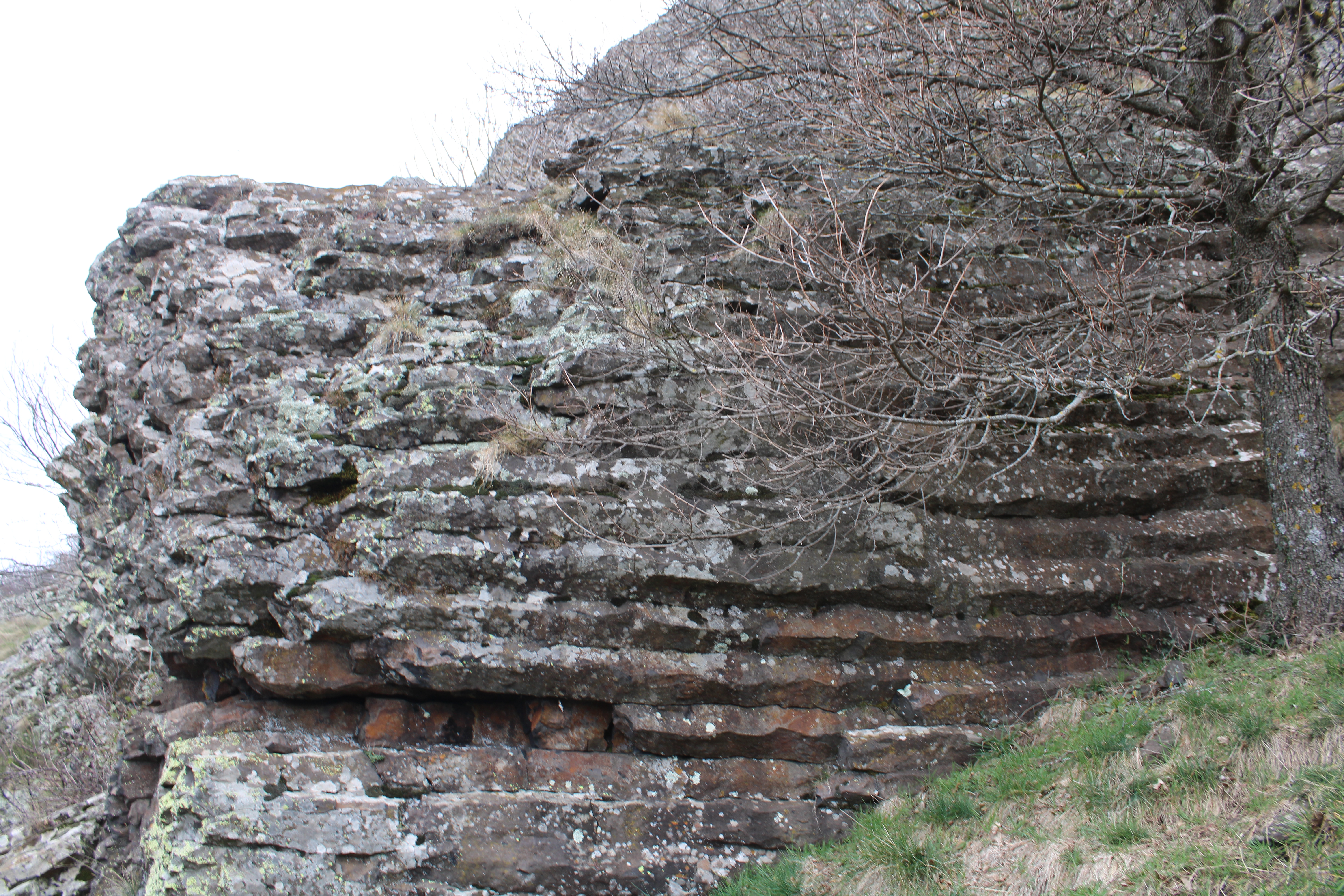 Le site du rocher du Brion a aussi un intérêt historique car il a abrité durant la période médiévale un village surmonté d’un petit château. Le côté remarquable vient du fait que pour bâtir ces constructions, on a utilisé les prismes et les orgues volcaniques pour construire des murs de pierre sèche du plus bel effet. Sur cette photo on voit bien les prismes horizontaux qui témoignent de la mise en place dans un conduit vertical.