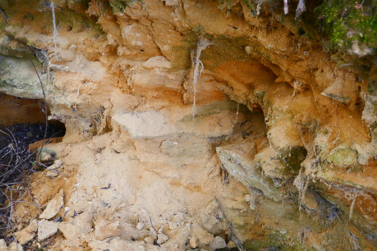 Le falun est un sable parfois consolidé en grès riche en fragments calcaires ayant pour origine des débris d’organismes divers dont de nombreux bryozoaires (éponges) accompagnés de débris d’oursins et surtout de mollusques. A Pontlevoy en plus des restes d’organismes calcaires on trouve aussi quelques éléments silico-clastiques comme le quartz et le feldspath. Le falun peut être soit un dépôt meuble (il est alors surtout utilisé en tant que sable et comme produit d’amendement des champs) mais peut être aussi parfois plus ou moins consolidé par un ciment (le plus souvent argilo-siliceux) et donner une pierre de taille dont la porosité en fait un bon isolant.