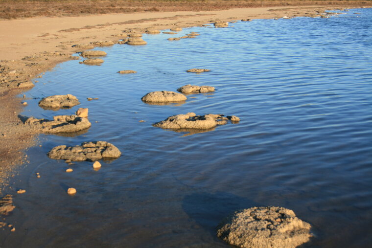Ces stromatolithes actuels et subactuels se développent au lac Thetis près du village de Cerventes en Australie occidentale. Les stromatolithes sont les plus connus et les plus fréquents des microbialites c’est-à-dire des structures (bioconstruction)formées par des organismes unicellulaires (le plus fréquemment des cyanobactéries autrefois appelées algues bleues) organisées en biofilms qui fixent en les calcifiant des particules sédimentaires. Les stromatolithes sont des microbialites à structure lamellaire contrairement aux thrombolites qui sont à structure globulaire comme dans le secteur du lac Clifton. Les stromatolithes du lac Thetis sont visibles en été (janvier à mars) à la faveur de la baisse du niveau du de l’eau.