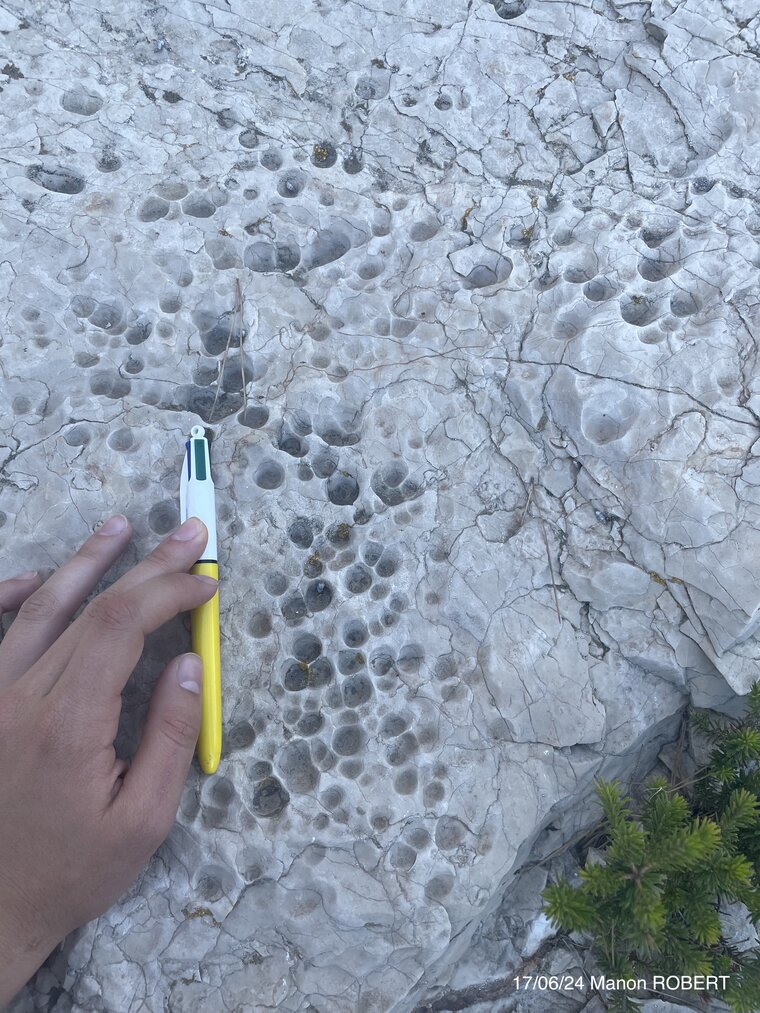 Si l’eau de pluie contient du CO2 (dissout), et que la roche est irrégulière, l’eau peut stagner un peu dans ces fragilités, causant la dissolution du substrat (localisée à chaque petite dépression). Début (centimétrique) de formation de lapiaz ?